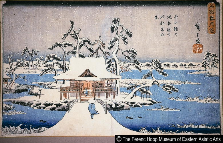 名所雪月花 井の頭の池弁財天の社雪の景/ Meisho setsugekka View of Benzaiten Hall in the Snow at Inokashira Pond |