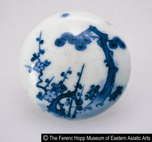 作品名 染付松梅文根付/ Netsuke with design of pine and plum blossoms