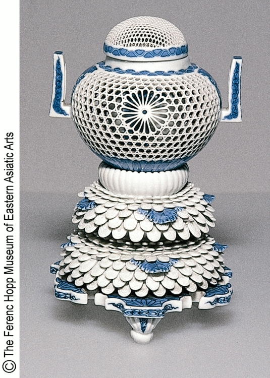 染付菊文蓋付三足香炉/ Incense burner with chrysanthemum petal stand |