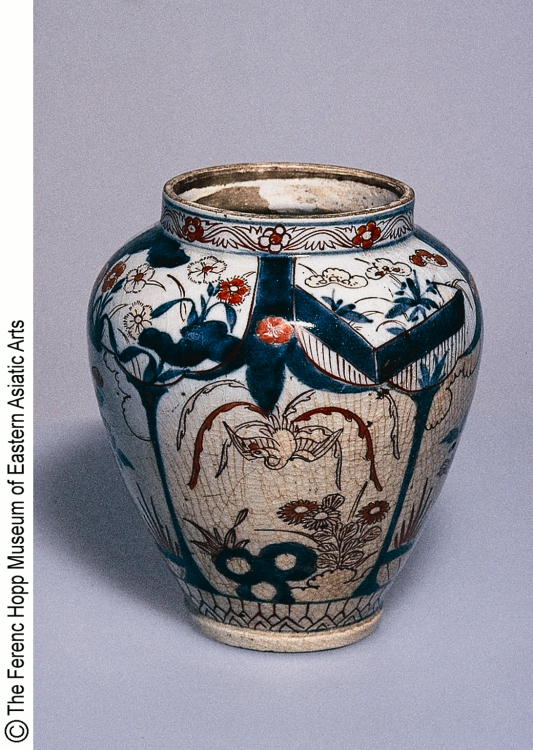 色絵鳳凰花盆文蓋付壷(蓋欠)/ Jar with design of phoenixes and flower arrangements (missing lid) |