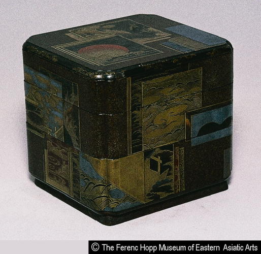 重色紙蒔絵重箱/ Stacked box with design of layered poem cards |