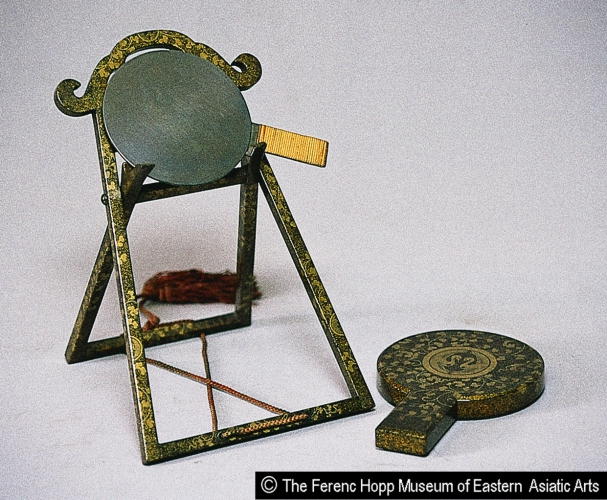 作品名 向鶴紋唐草蒔絵鏡建及び柄鏡箱/ Mirror stand and box