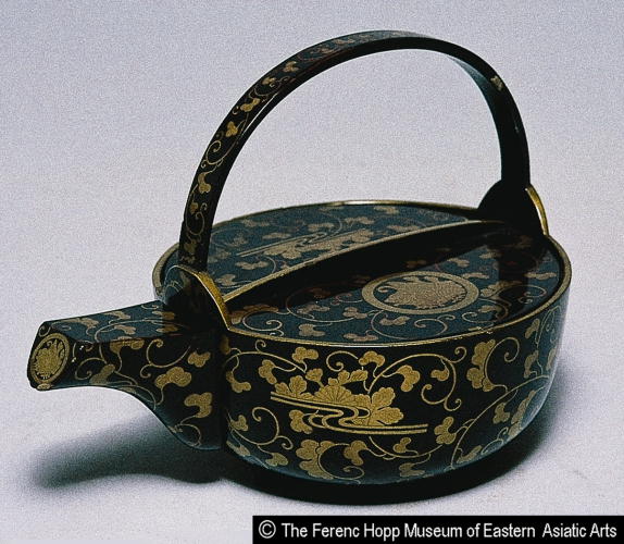 揚羽蝶菊水紋散唐草蒔絵提子/ Sake pitcher with design of scattered, crests and karakusa |