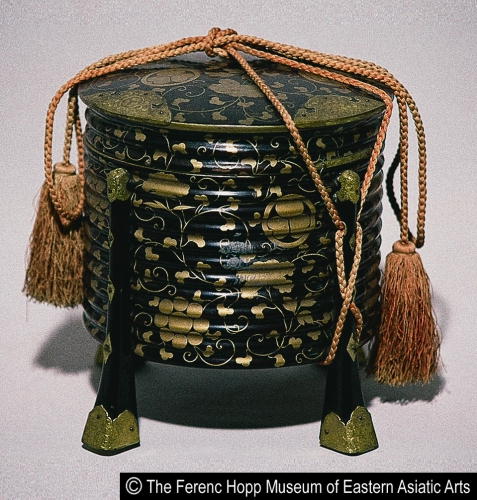 葵紋九曜星散牡丹唐草蒔絵行器/ Box with design of hollyhock crests, kuyosei, peonies, and karakusa |
