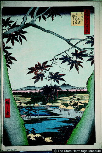 名所江戸百景 真間の紅葉手古那の社継はし/ Meisho Edo hyakkei Maple Trees at Mama, Tekona Shrine and Tsugibashi |