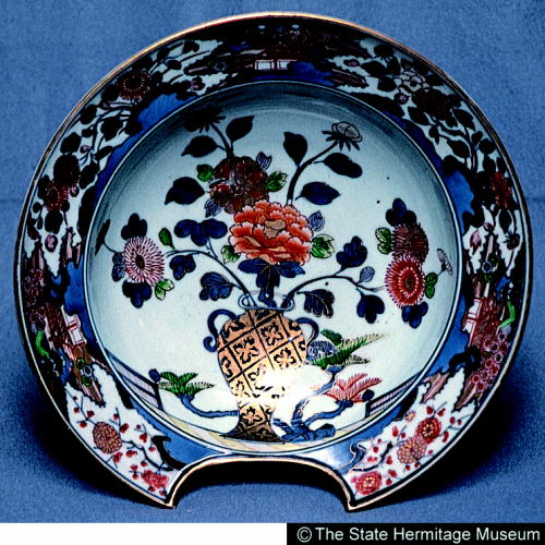 伊万里色絵牡丹菊文髭皿/ Barber's bowl with design of peonies and chrysanthemums |