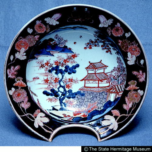 伊万里色絵山水楼閣文髭皿/ Barber's bowl with design of pavilion in a landscape |