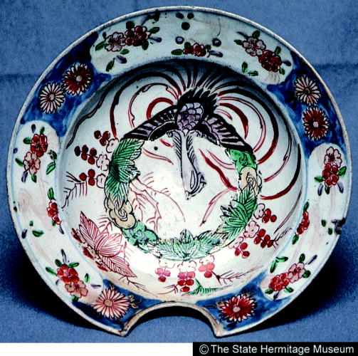 伊万里色絵鳳凰花卉文髭皿/ Barber's bowl with design of phoenix and flowers |