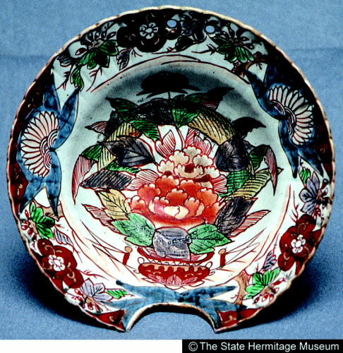 伊万里色絵牡丹文髭皿/ Barber's bowl with design of peonies |
