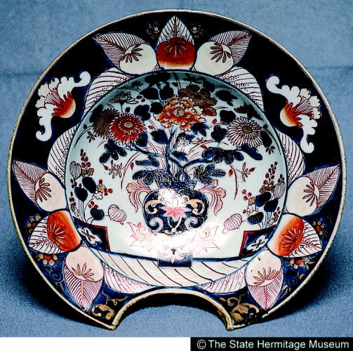 伊万里色絵牡丹菊文髭皿/ Barber's bowl with design of chrysanthemums and peonies |
