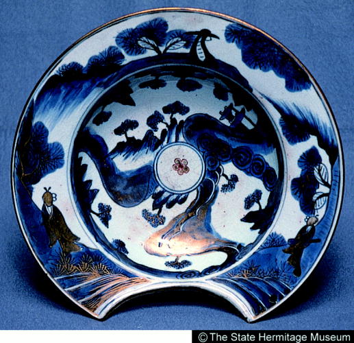 伊万里染付金彩山水文髭皿/ Barber's bowl with landscape design |