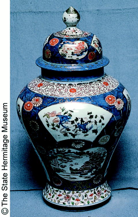 伊万里色絵山水楼閣文有蓋壷/ Covered jar with design of pavilion in a landscape |