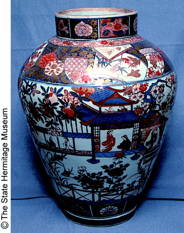 伊万里色絵人物建物文壷/ Jar with design of figures and buildings |