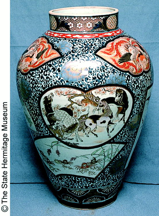 伊万里色絵馬唐獅子文壷/ Jar with design of horses and Chinese lions |