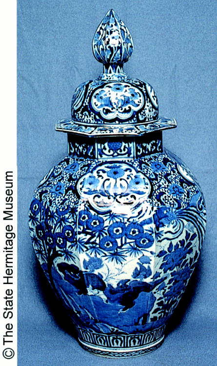 伊万里染付唐獅子文八角有蓋壷/ Octagonal covered jar with design of Chinese lions |