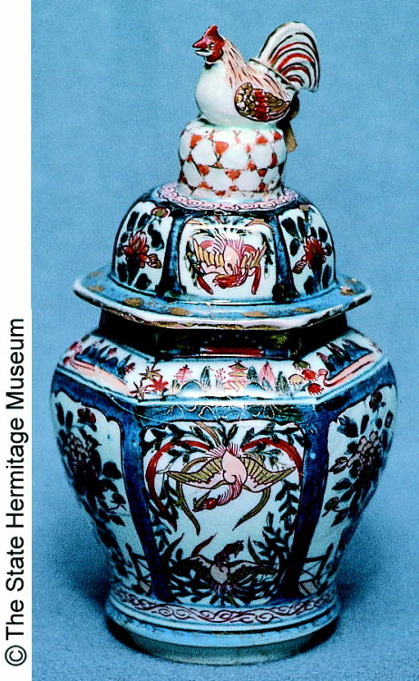 伊万里色絵鳳凰牡丹文六角有蓋壷/ Hexagonal covered jar with design of phoenixes and peonies |
