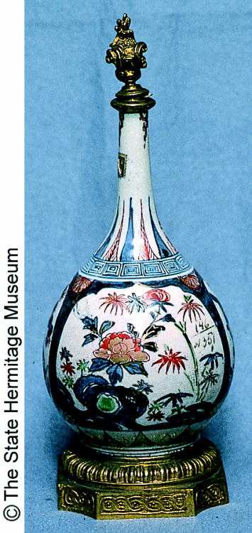 伊万里色絵花卉文金具付瓶/ Bottle with metal fixtures and design of flowers and grasses |