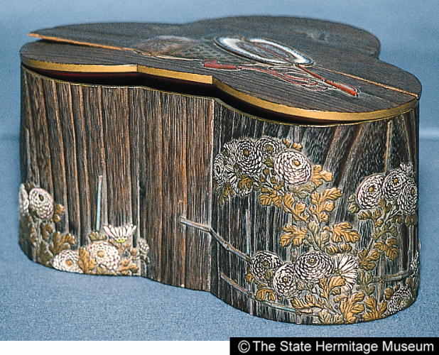枕団扇菊蒔絵螺鈿陶器嵌装箱/ Box |