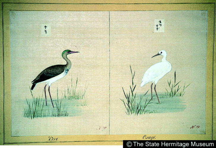 『日本』巻一:鳥(95種) ケリ・オヲサギ/ Gray-headed Lapwing/Great White Heron |