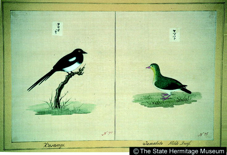 『日本』巻一:鳥(95種) カササギ・ヤマハト/ Magpie/Mountain Dove |