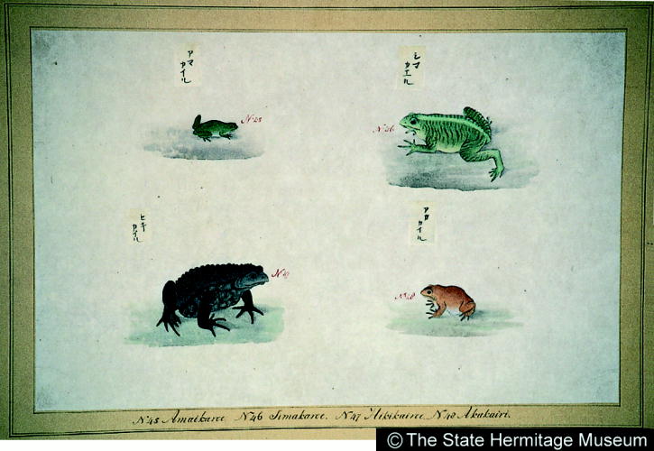 『日本』巻一:虫(100種) アマカイル・シマカエル・ヒキカイル・アカカイル/ Amakairu/Shimakaeru/Hikikairu/Akakairu |