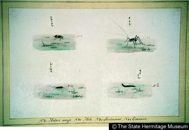 『日本』巻一:虫(100種) ヘヒリムシ・イトト・シリハサミ・ヲサムシ/ Hehirimushi/Camel Cricket/Shirihasami/Ground Beetle |