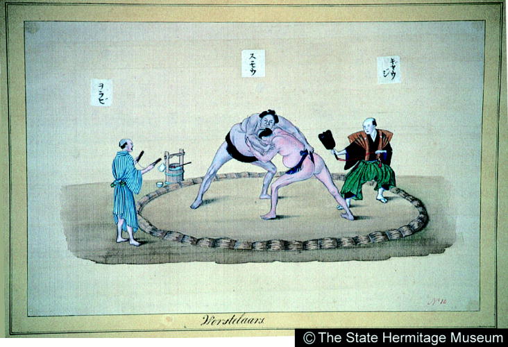 『日本』巻二:風俗 をらび・角力・行司/ Announcer/Sumoo Wrestlers/Referee |