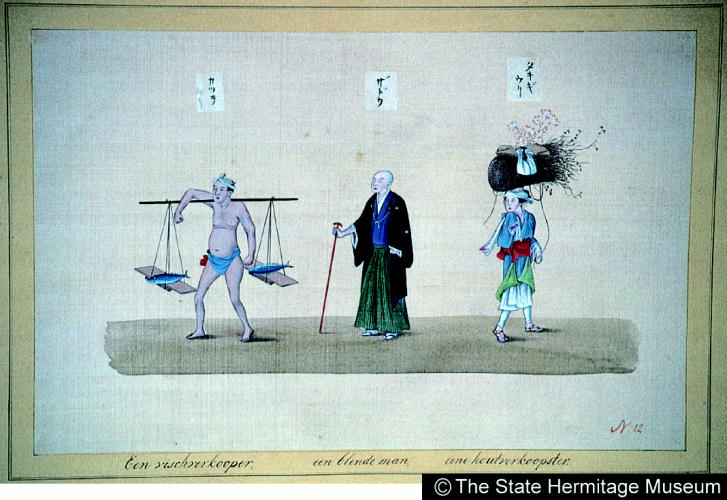 『日本』巻二:風俗 座頭・鰹売り・薪売り/ Bonito Seller/Blind Masseur/Woodseller |