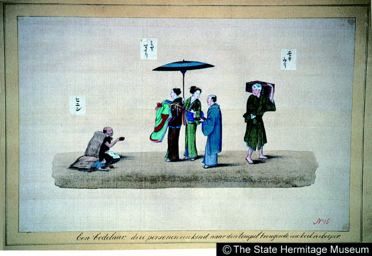 『日本』巻二:風俗 非人・宮参り・餅売り/ Beggar/First Visit to a Shrine/Rice Cake Seller |