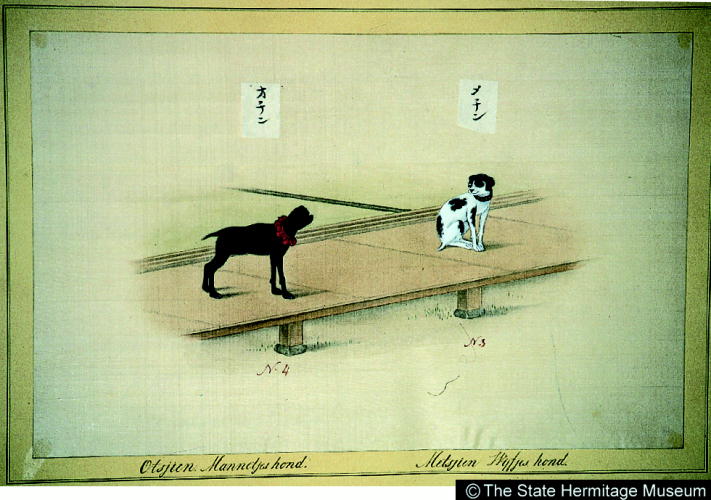 『日本』巻三:動物(30種) 雄狆・雌狆/ Male and Female Chin Dogs |